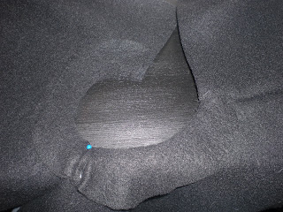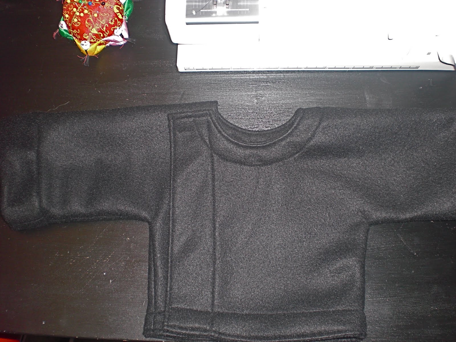 Step 7 a: Pin seam down to the outside of the jacket matching the seams at the shoulder. (as pictured above. Then sew around the neck line.