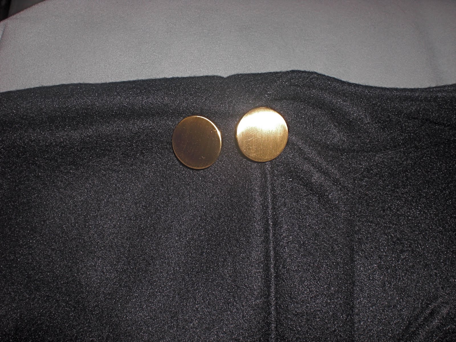 I added two little gold button at the top corner by the neck opening on the “short” side of the jacket. Then on the inside of the other flap on the top corner I put two little elastic loops that would line up with the buttons.
