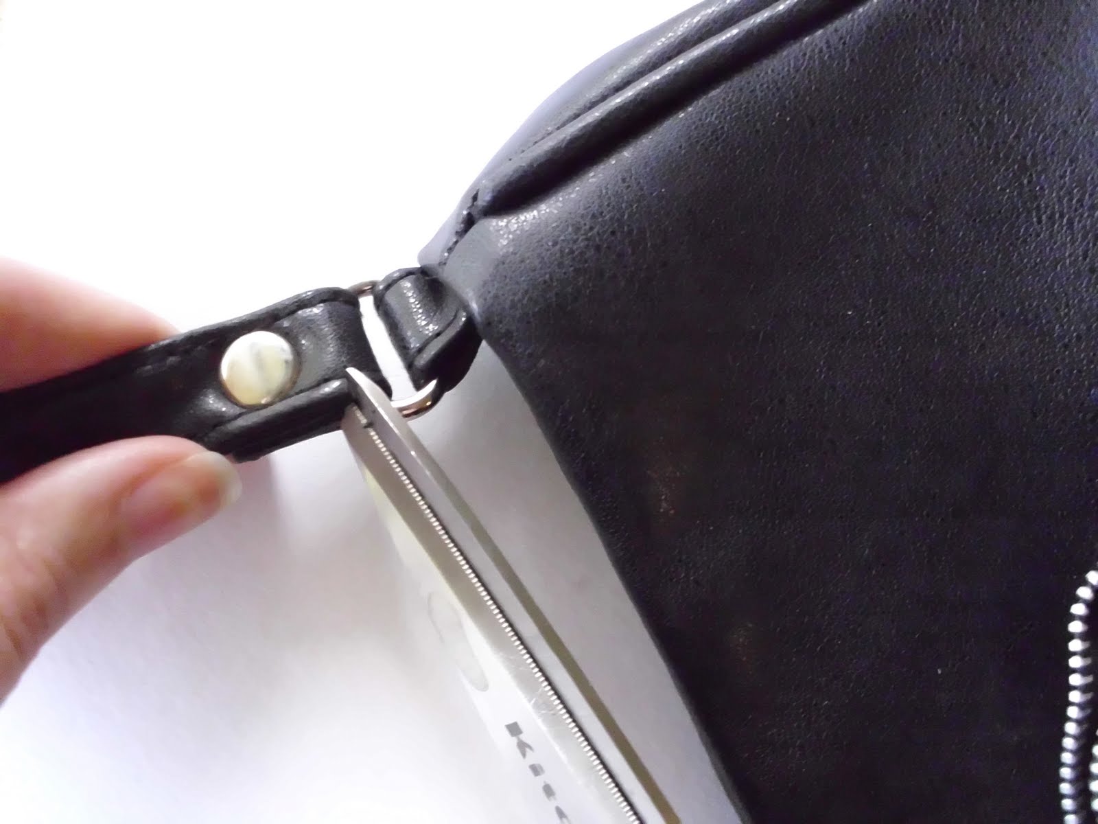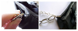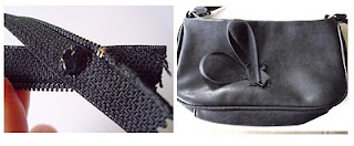 STEP TWO: Position the zipper ribbons on the purse. Place a drop of glue on the back and press firmly on purse. If your purse is thin enough you can stitch it in place as well. Repeat with second ribbon.