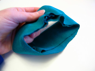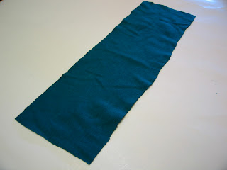 | To make the turtle neck cut a strip (that will be folded in half) The strip should stretch enough to fit over your childs head, but small enough that it will look ok around the neck of the kid. |