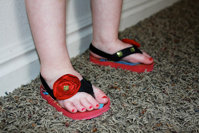 | I made these silk flowers and added some rhinestones.It took no time at all and now the little miss has some lovely new shoes to show off her pedicure from mommy daughter night… |