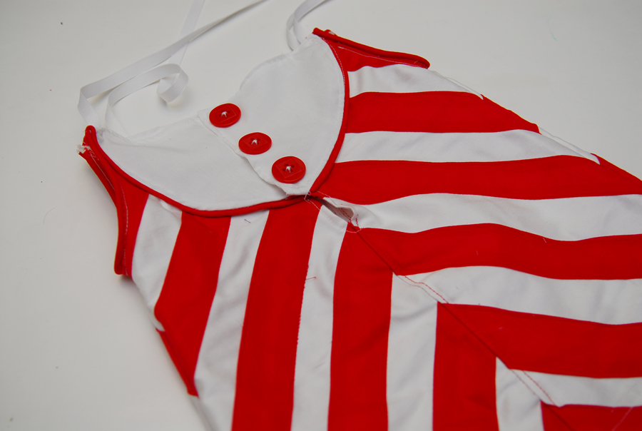 Add some buttons to the back if you did two panels, which after I did it I decided it was not necessary since the top ties it can just slip on and off over the head, but it added a little something to the back anyway so I am ok with it. Hem the bottom to your liking and you are done..