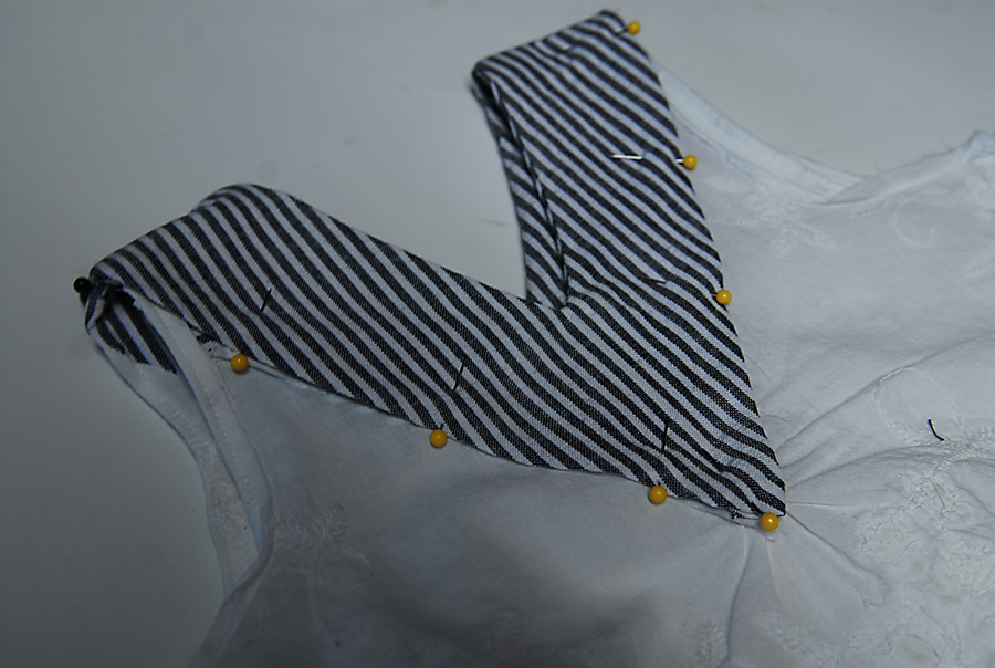 Next (and it is a little hard to tell that it was done but it was) Sew the other neckline piece to the neckline. Right sides together sew only along the inside of the neckline. Then turn it around to the back side.