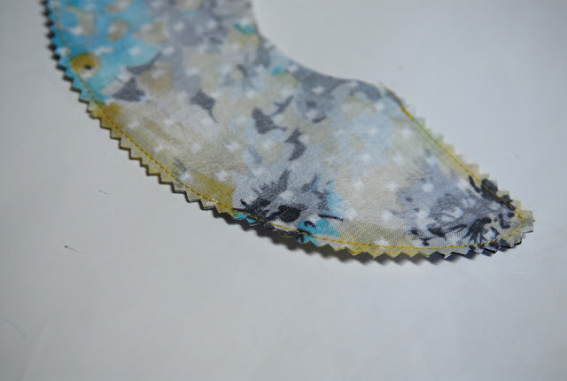 Then take two of them and sew them right sides together. Next I use pinking shears to trim the curve since it is easy and fast and helps the curve. Don’t sew along the neckline you are only sewing the outside edge.