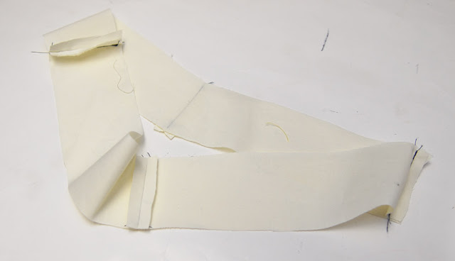 Now for the pants sew a front and back leg right sides together along the straight edge and from the curve of the crotch to the ankle.