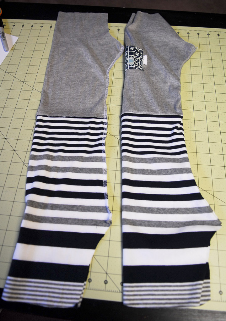 Now you should have a very long pair of pants 🙂 With the pants right side out tuck the un-sewn pant legs into the sewn pant leg. So the striped legs will get tucked inside the grey pant legs.