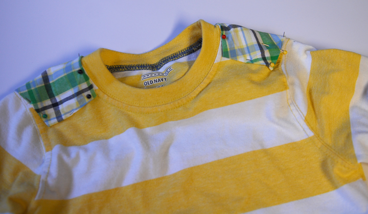 Then pin the yoke to the tee all around the edges. When I work with fabrics that stretch I pin pretty often so everything is in the right place. Then sew around the edge as close to the edge as you can.