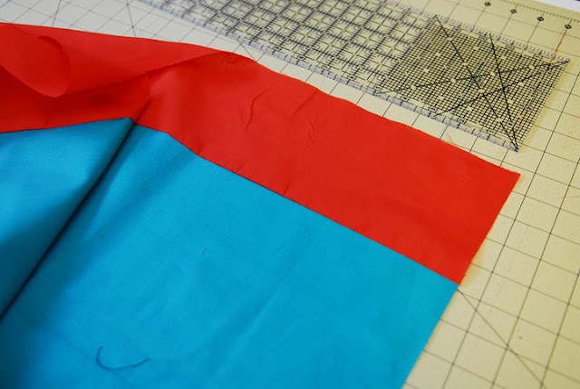 Start by sewing the color block and the main skirt piece right sides together along the long width. Press it up flat.