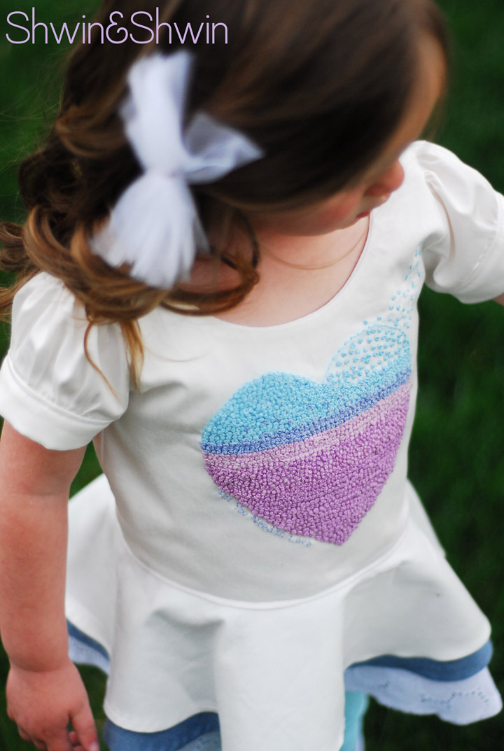 This was a design that I had been dreaming up ever since I made this top and I finally decided now was the time to execute the design. Which I did twice since my first one had some really unfortunate mishaps, but I may share it later this week. The top has 3 layers of a circle skirt hem each one with a rolled hem. I knew I wanted to focus on embroidery for the challenge since it was and is my first love. (even before sewing) So I stitched up hundreds of little french knots to form a heart. The design was made to look like birds flying in to form the heart, and the knots fade in the same ombre effect as the pants. I also embroidered the words “All you need is love” along the bottom of the heart. It was truly a labor of love. I got really good at stitching french knots while nursing a baby or rocking a baby to sleep.