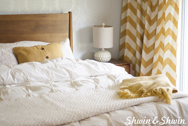 We decided to keep all the main bedroom colors and bedding neutral and light, one because we were so tired of the dark depressing room before and because then when we get bored with the mustard color we can swap out the curtains and the accent pillows and we have a whole new look.
