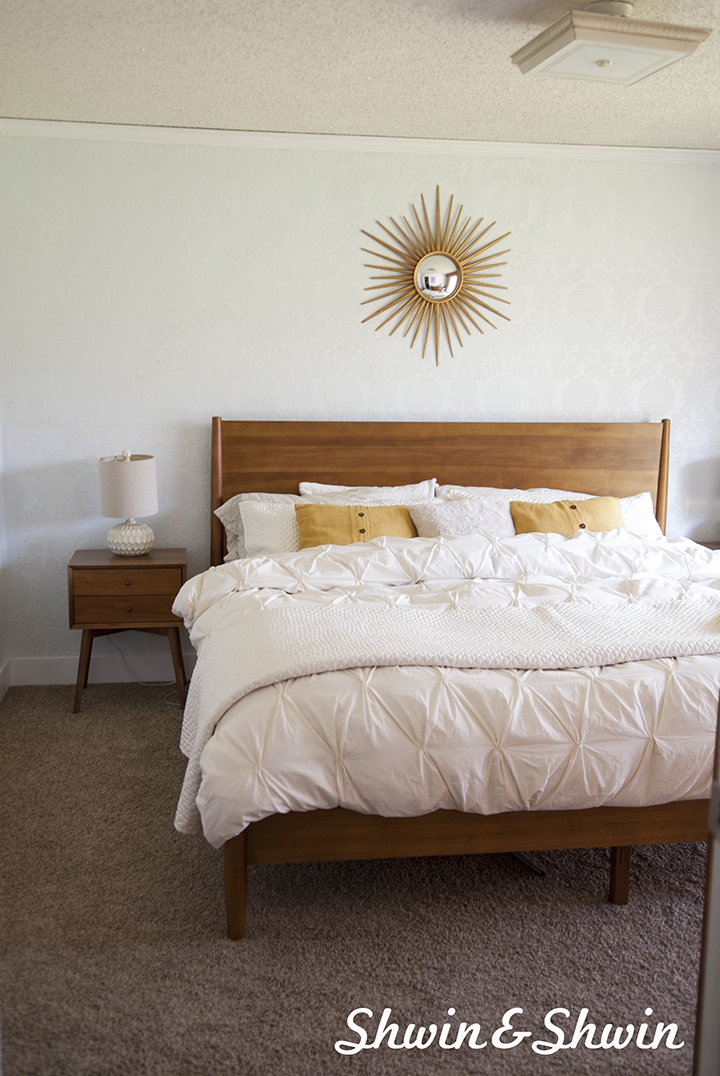 This whole room is fantastic, I love it! I love the MCM feel too, but my husband would love to distress everything (are we totally backwards or what?) so we meet in the middle somewhere totally undefined and lost. I am pretty sure that bedding would have jumped in my hands too- I absolutely love LOVE white bedding!! Also, that wallpaper turned out great! It really adds a lot to the room but isn&#